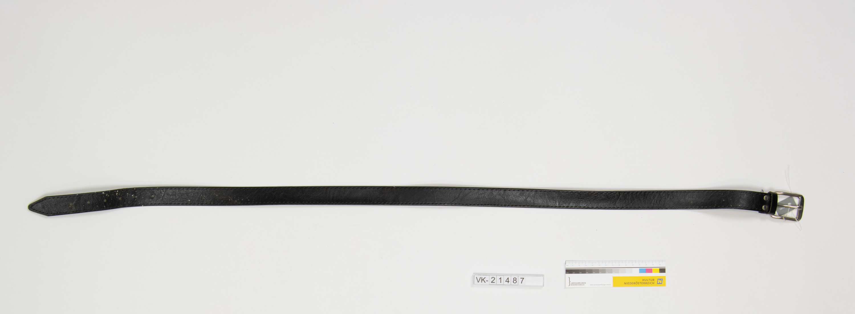 Schwarzer Ledergürtel (möglicherweise Kunstleder) mit silberner Dornschließe.