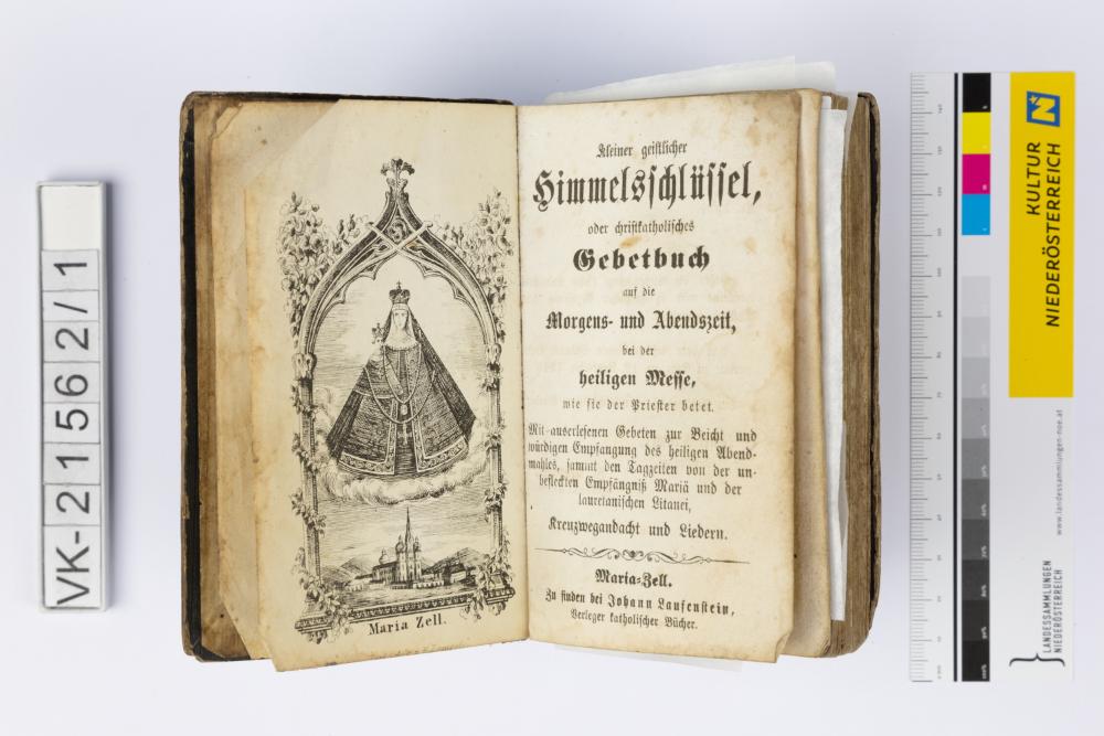 Gebetsbuch in einem geprägten Ledereinband: "Kleiner geistlicher Himmelsschlüssel oder Christkatholisches Gebetbuch ...", 228 Seiten. In den Umschlägen sind verschiedene handschriftliche Notizen, u.a. "Maria Gruber 1884", "Anna Mörk". Im Buch sind verschiedene Einlagen.