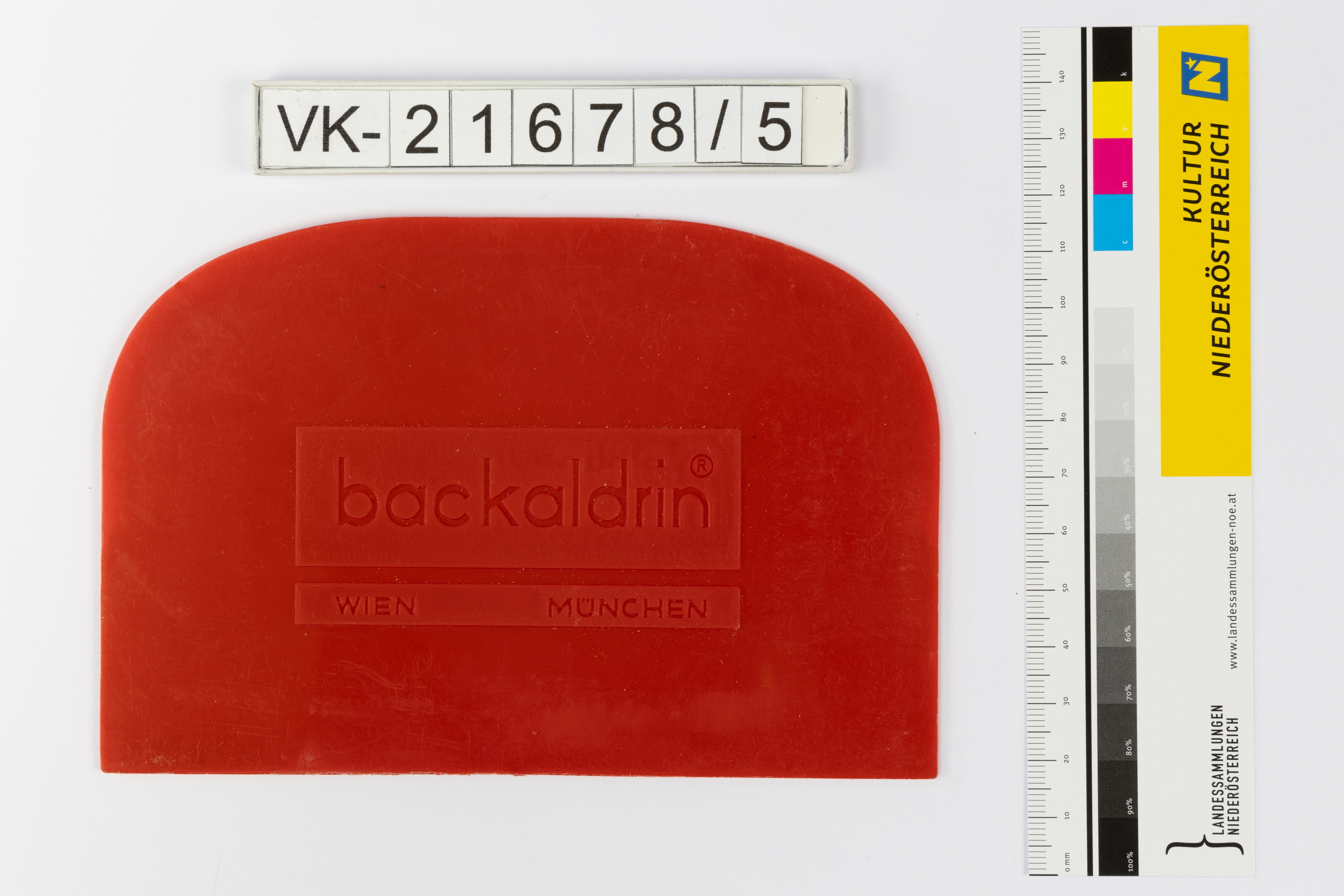 Annähernd rechteckige Teigkarte aus rotem Kunststoff, mit eingeformter Beschriftung: "backaldrin WIEN MÜNCHEN".