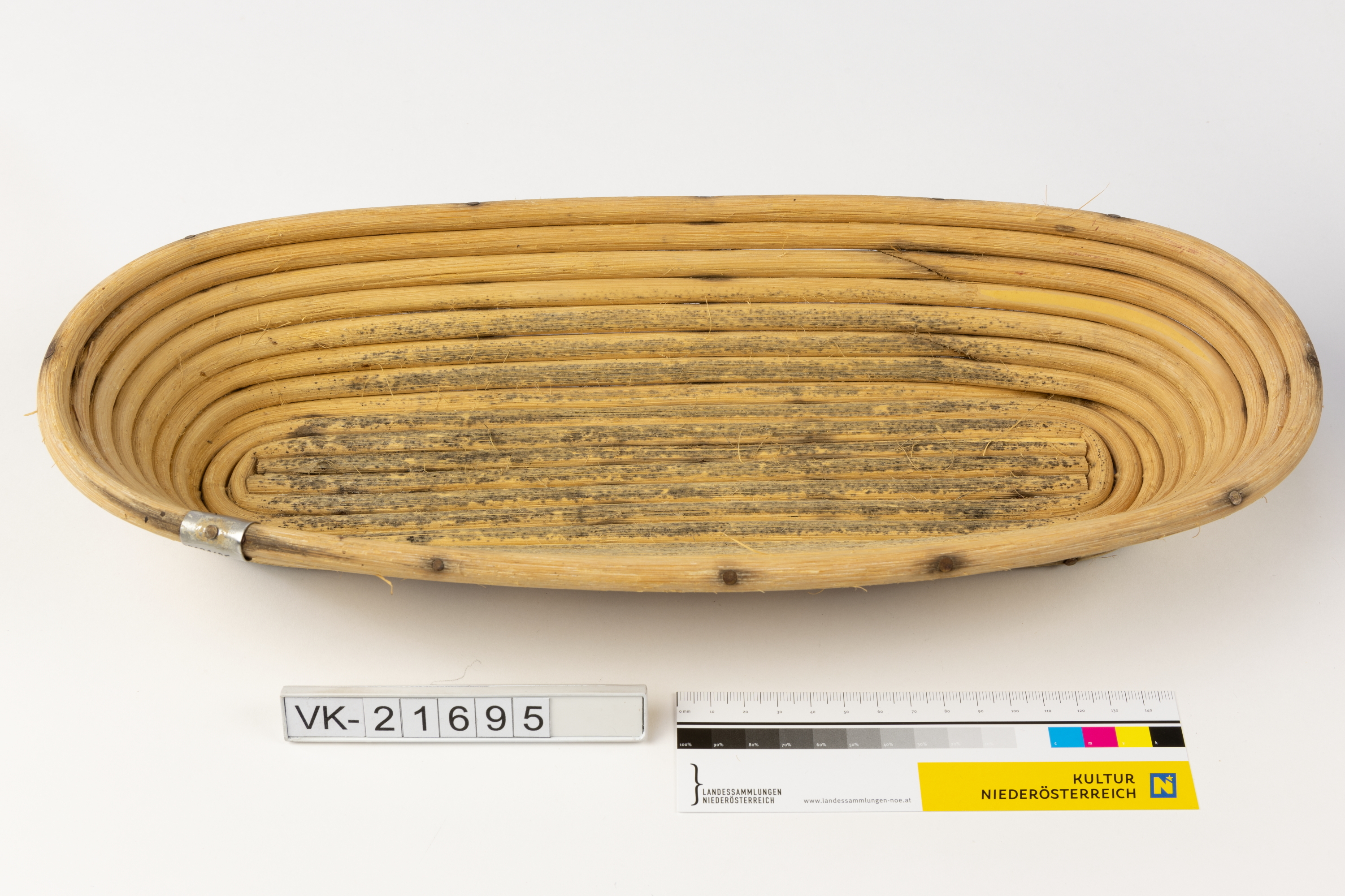 Oval-längliches Simperl aus Weide mit einer geprägten Metallklammer: "BÄKO".