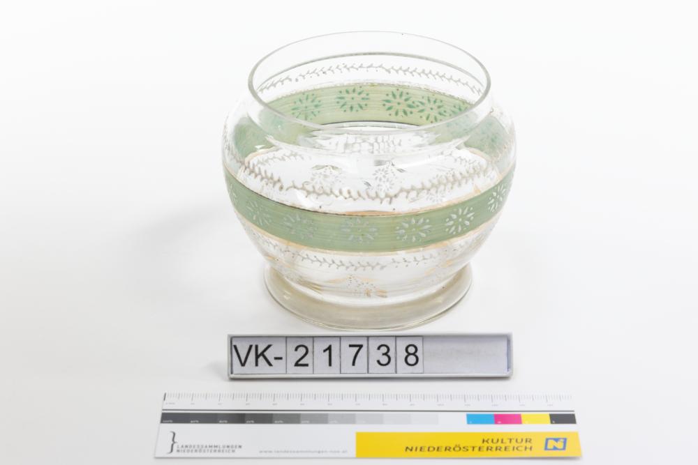 Bauchige Glasschüssel mit angesetzter Fußzone. Die Schüssel ist mit umlaufenden Ringen in gold und grün sowie weiß gemalten Zierstreifen und stilisiert-floralen Elementen verziert. Der Randform nach zu urteilen hatte die Schüssel einen Deckel.