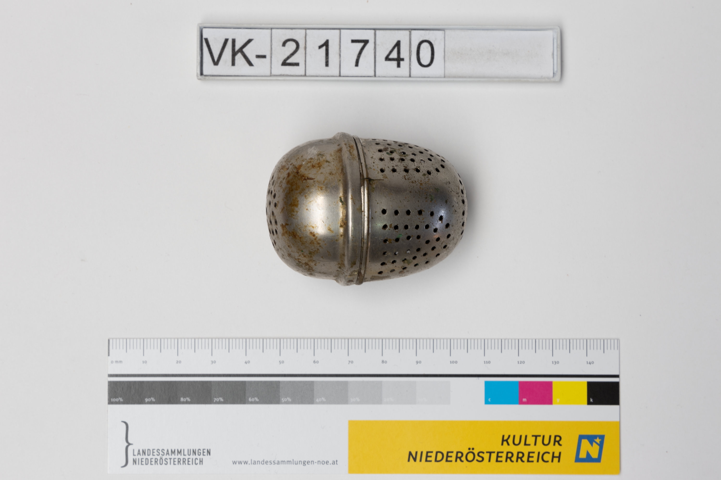 Zweiteiliges Teeei (a, b) aus Blech, teilweise gelocht.