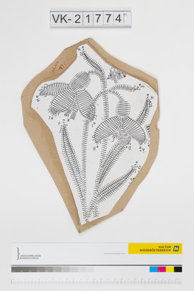 Klöppelbrief für ein Schneeglöckchenelement: Fotokopie, aufgeklebt auf einen braunen Karton, darauf handschrifltiche Notizen. Fr. Bracher veranstaltete in den 1970er- und 1980er-Jahren Klöppelkurse über den ÖFB.