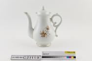 Bauchige Kaffeekanne mit Henkel, geschwungener Tülle (VK-22010a) und einem Deckel (VK-22010b). Die Glasur ist dunkelbraun und weiß mit verlaufendem Streifenmuster. Auf dem Boden befindet sich ein Markenzeichen: "Gräfenroda Carstens.