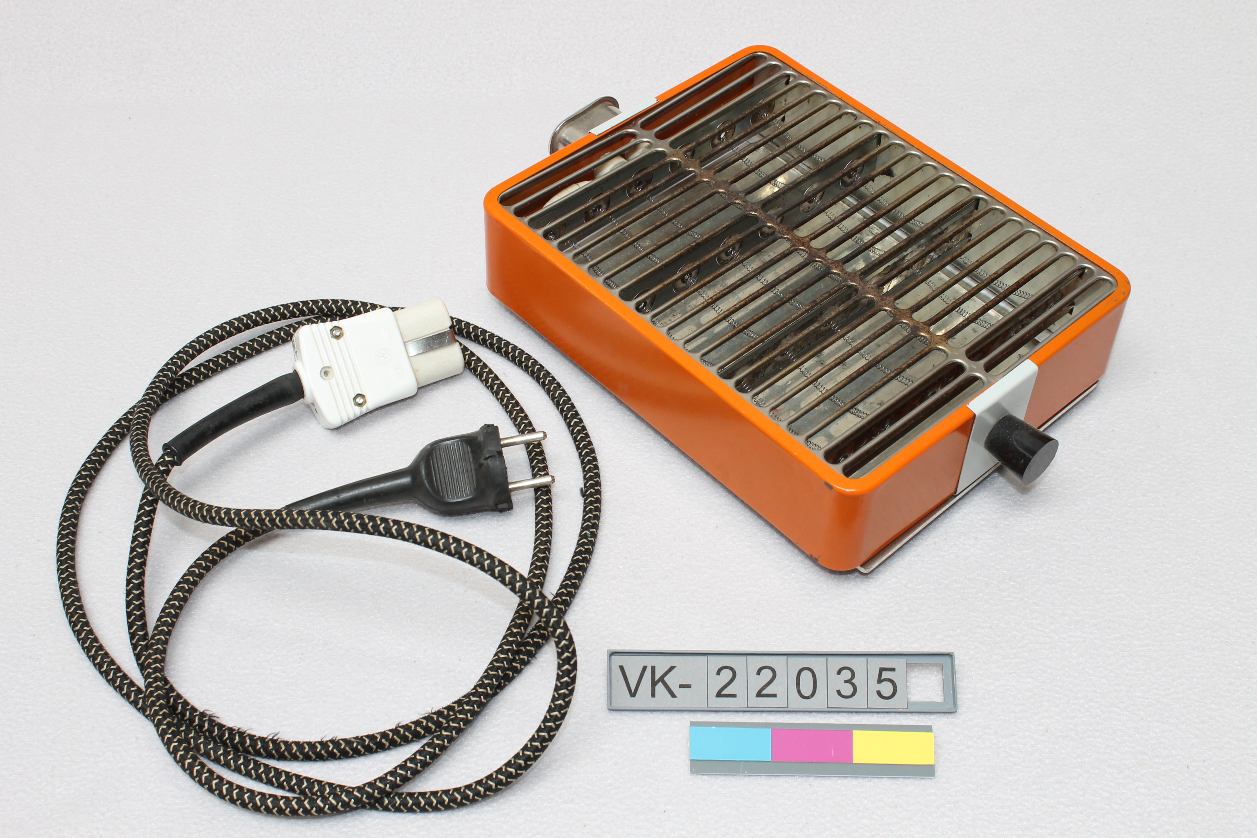 Kleiner quaderförmiger Heizstrahler (VK-22035a) mit orangem Gehäuse, auf der Rückseite ein Einschub für einen Reflektor, dazu ein textilummanteltes Kabel (VK-22035b). Auf der Rückseite ist eine Prägung: "MINI ...", auf dem Keramikstecker sind Prüfzeichen.