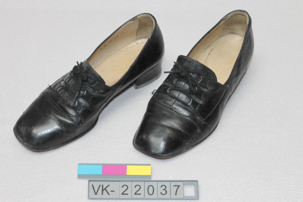 Ein Paar (a, b) schwarze Damenhalbschuhe mit Schnürung auf drei Lederschlaufen und breitem Blockabsatz. Die Schuhe sind beschriftet: "INA", "PONTE GELENK".