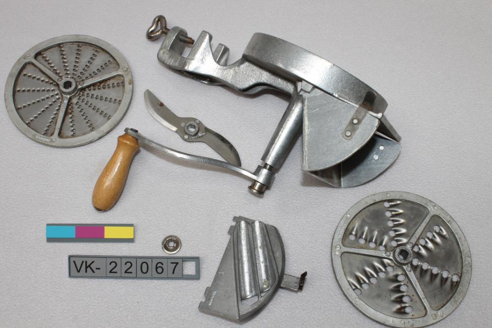 Küchenmaschine mit Handkurbelbetrieb: Die Maschine besteht aus einem Rahmen (VK-22067a) mit aufsteckbaren Zuführtrichtern (VK-22067c und VK-22067d) und einer Kurbel mit Achse (VK-22067b). Der Maschine liegen vier Schneid- und Reibeinsätze bei (VK-22067g bis VK-22067j). Zusätzliche Kleinteile: Mutter (VK-22067e) und Auflage für Tischgewinde (VK-22067f). Ein Prospekt zu dem Gerät ist unter der Inventarnummer VK-22043 vorhanden.