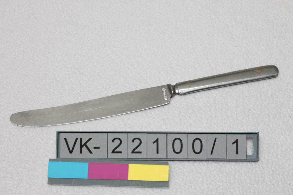 Messer mit abgerundeter Klinge und geradem Griff. Auf der Klinge ist eine Beschriftung: "PILS-WERKE ROSTFREI".