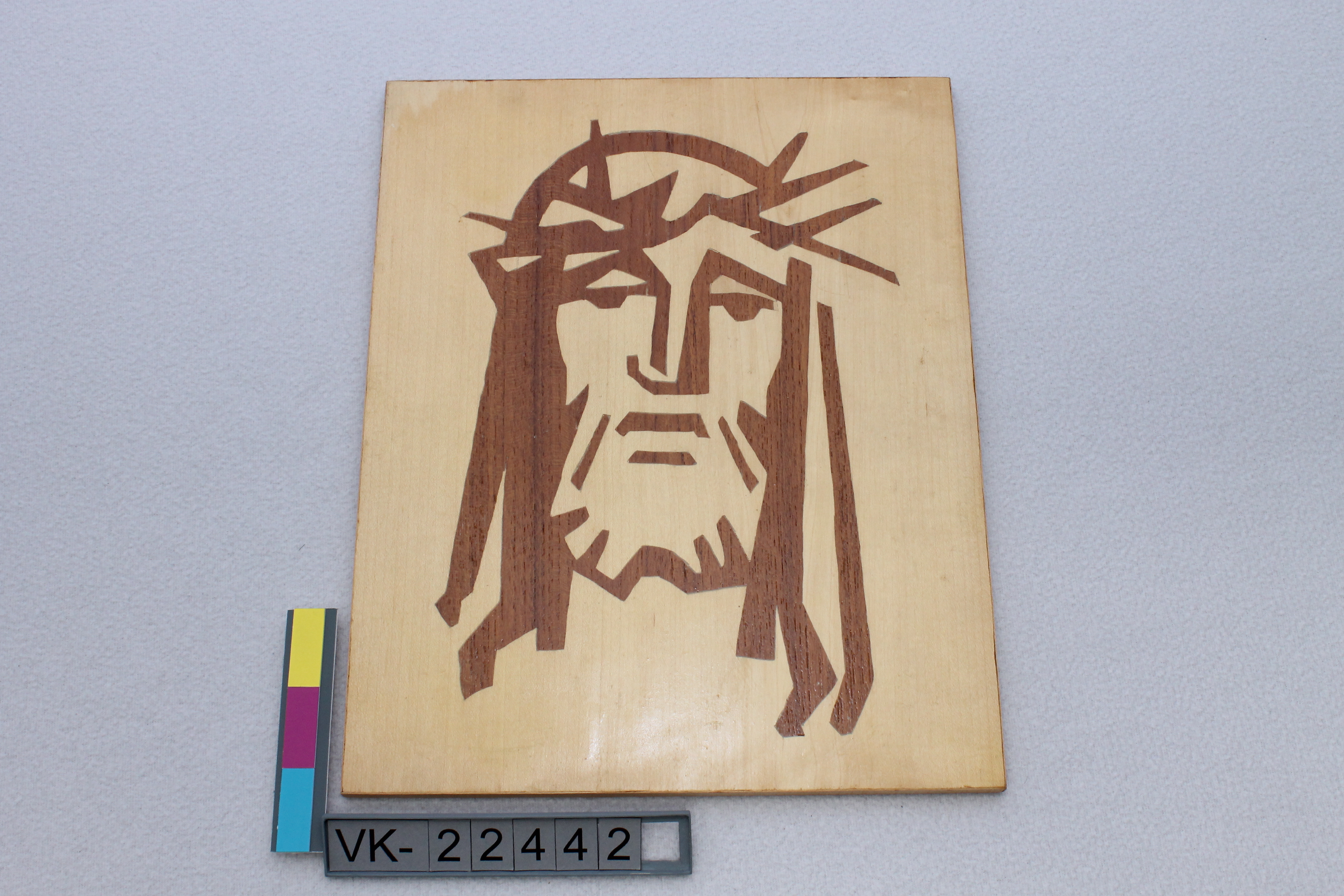 Furniereinlegearbeit in hell und dunkel auf einer Pressspanplatte: Christus. Auf der Rückseite eine handschriftliche Beschriftung: "PRAHER".