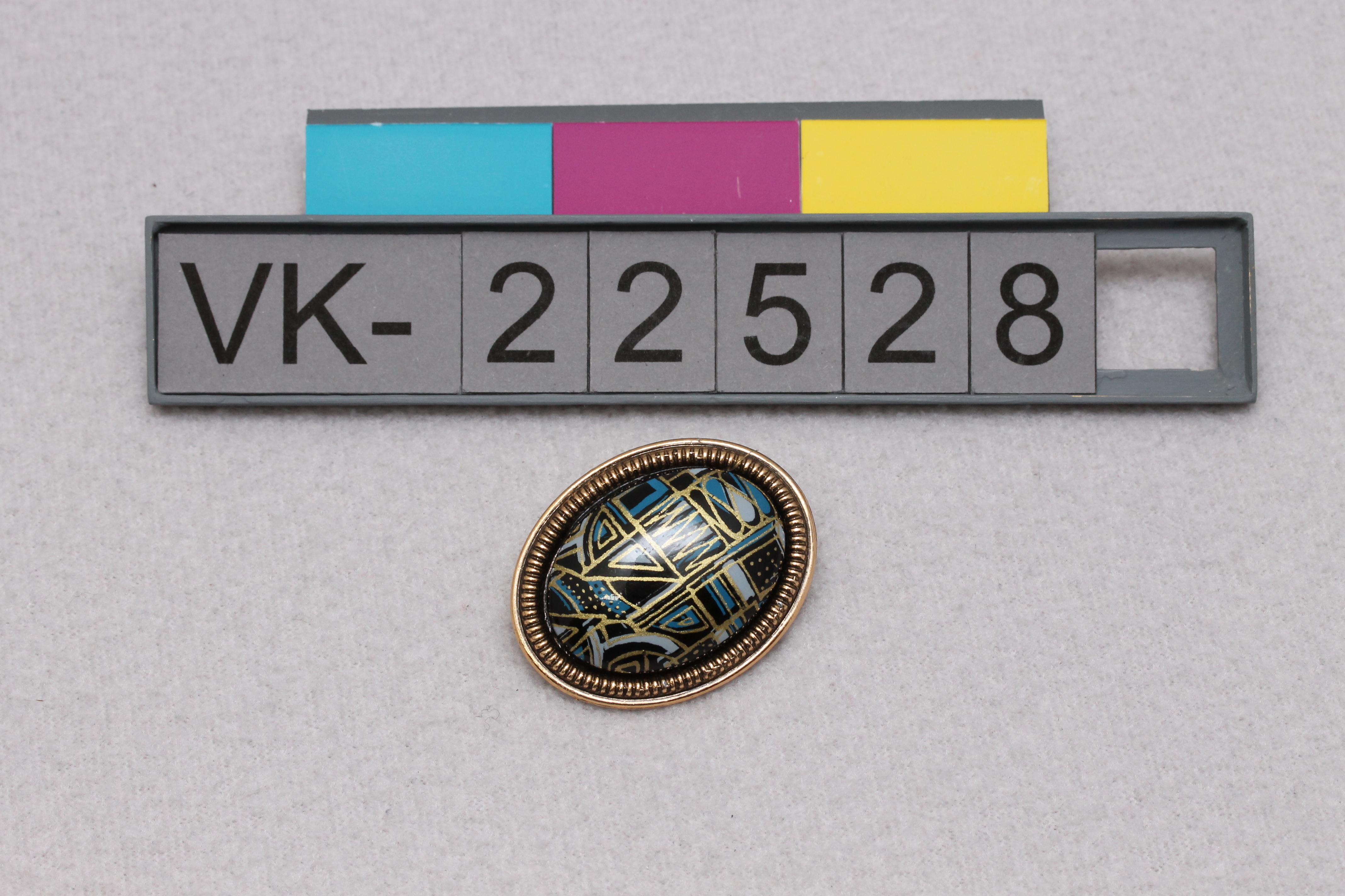 Ovale Brosche, Rahmen und Rückseite goldfarben, mit einem abstrakten Mustermotiv in blau, schwarz, grau und gold.