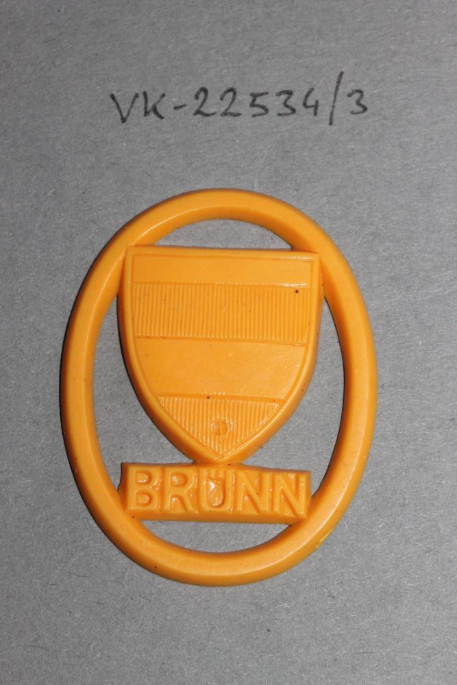 Oranges Kunststoffwappen in ovalem Rahmen mit Schriftzug: "BRÜNN".
