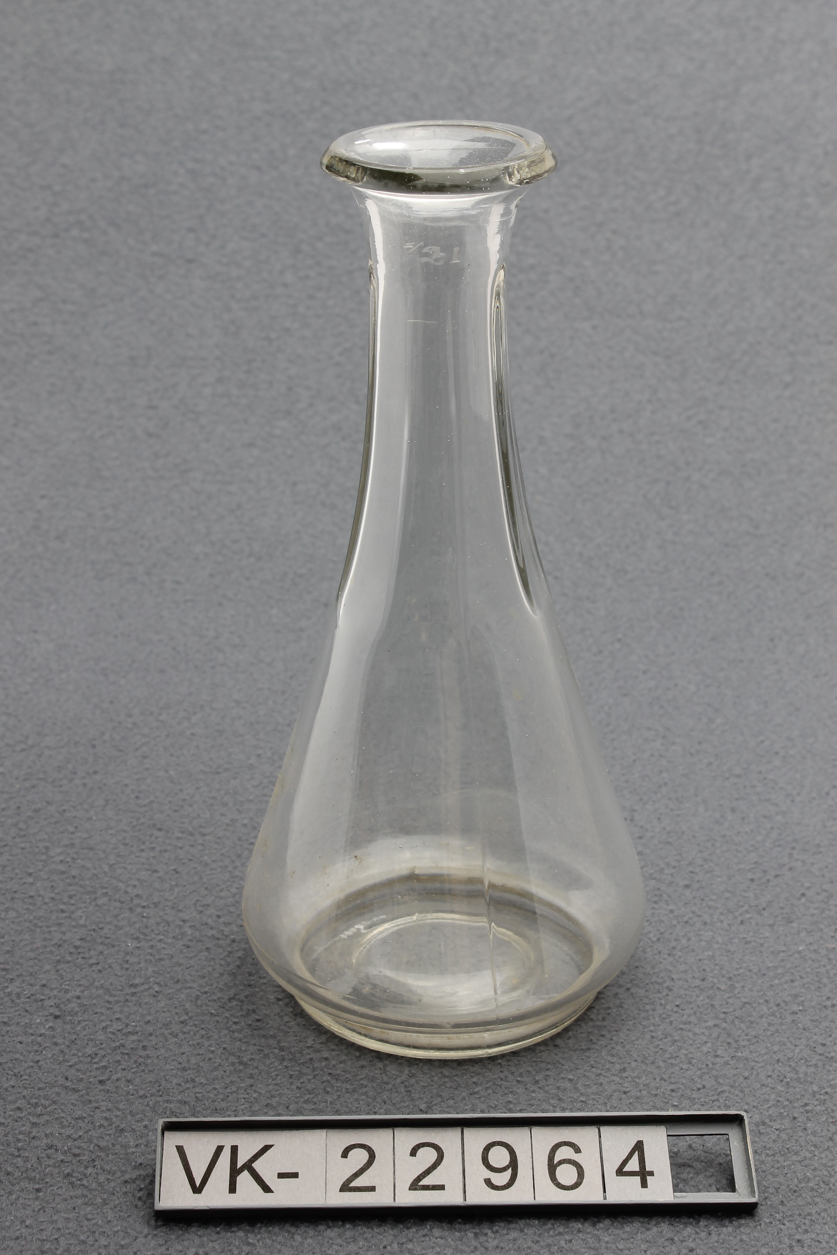 Konische Karaffe mit senkrechter Profilierung im Halsbereich, ausgestelltem Rand, Eichstrich und Maßzahl.