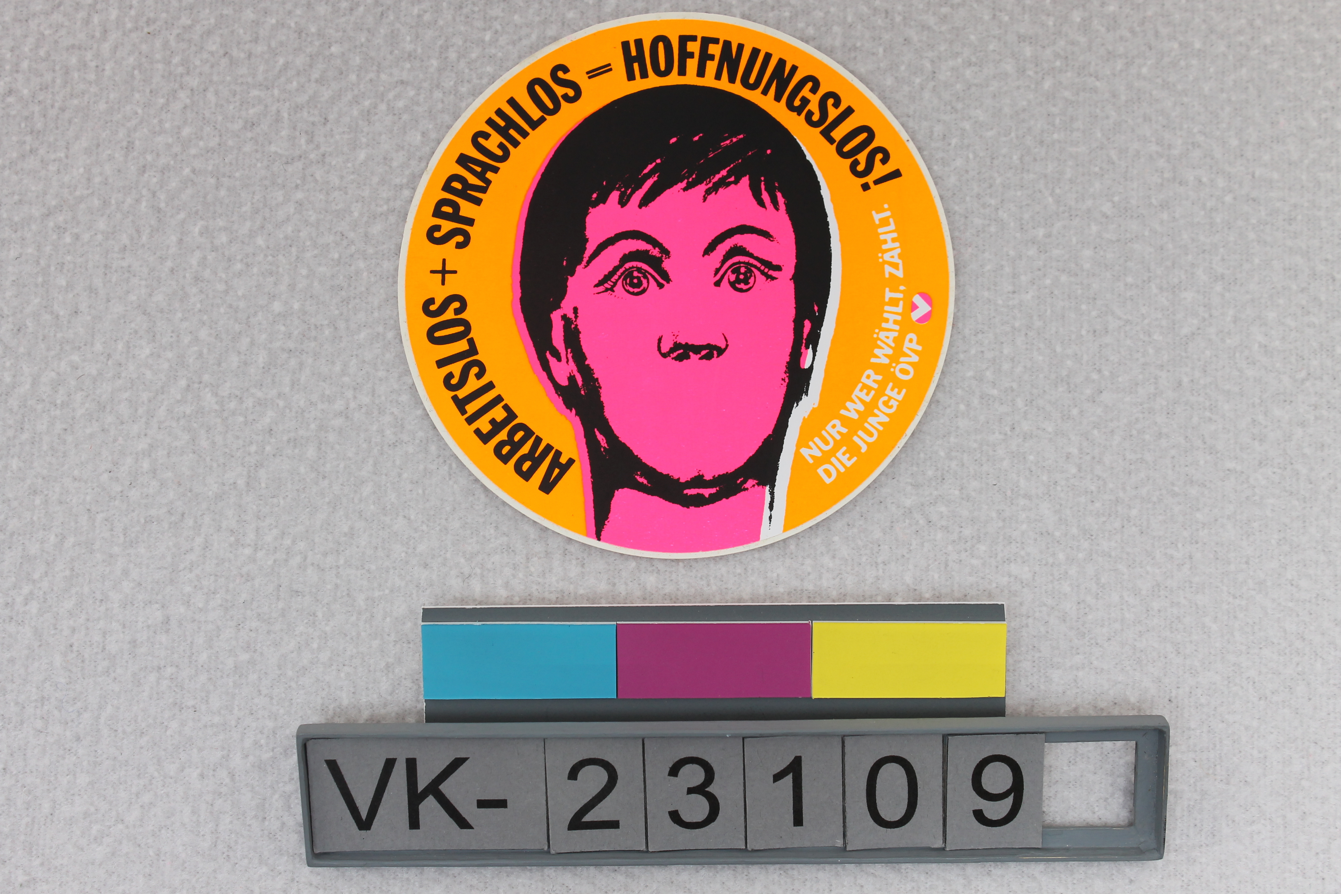 Runder Aufkleber, gestaltet in orange und rosa mit schwarzer und weißer Schrift: "ARBEITSLOS + SPRACHLOS = HOFFNUNGSLOS!", weitere Beschriftung, Gesicht; Aufkleber der jungen ÖVP.
