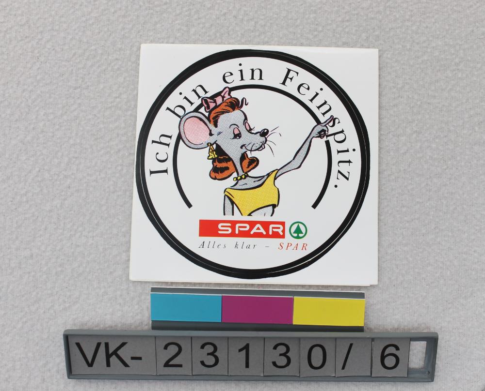 Werbeaufkleber für Spar mit der Darstellung einer Maus als Dame mit Käse-Ohrhängern, darüber im Halbkreis: "Ich bin ein Feinspitz.".