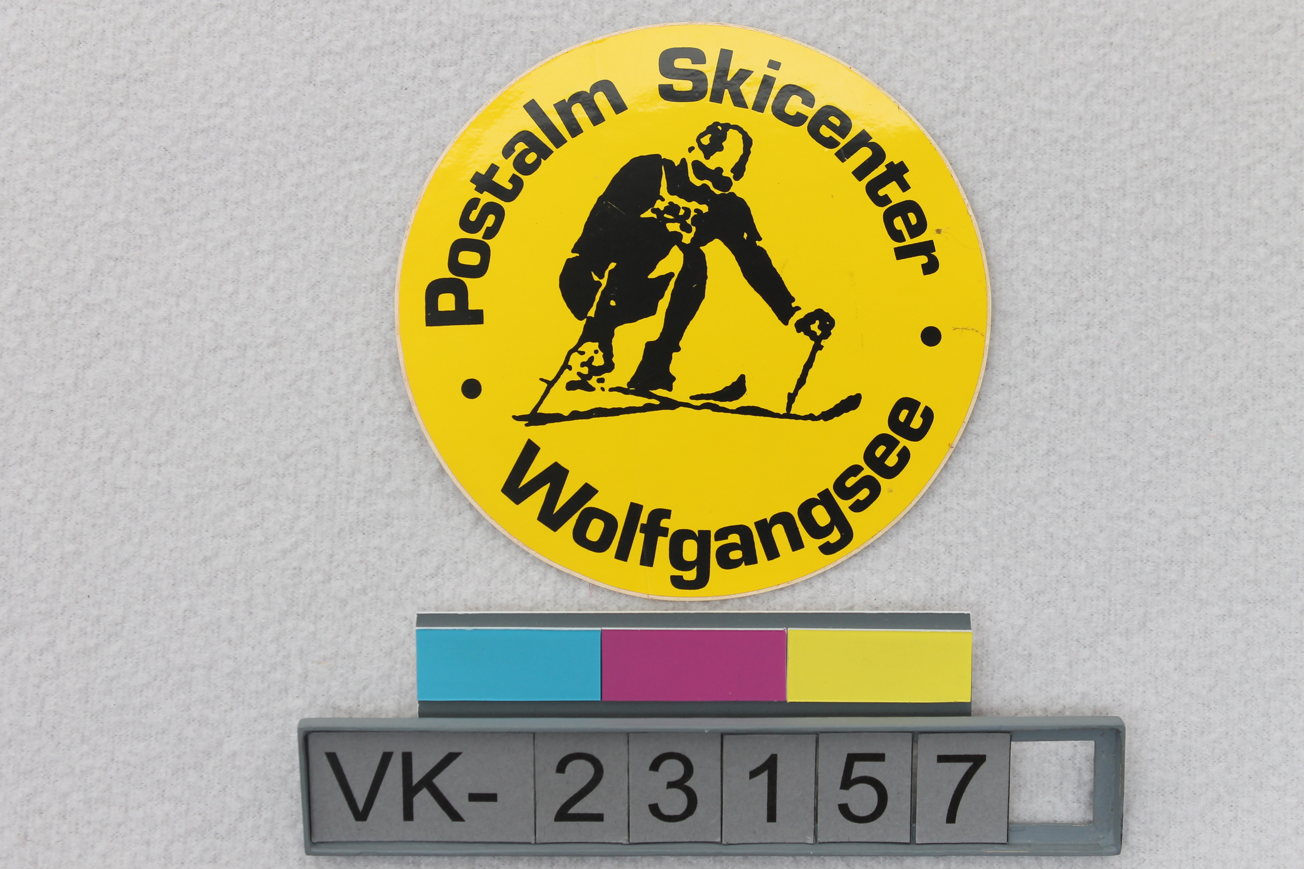 Runder gelber Aufkleber mit einem schwarzen Schifahrer und schwarzer Beschriftung: "Postalm Skicenter Wolfgangsee". Auf der Rückseite die Herstellermarke der Folie: "FasCal PERMANENT".