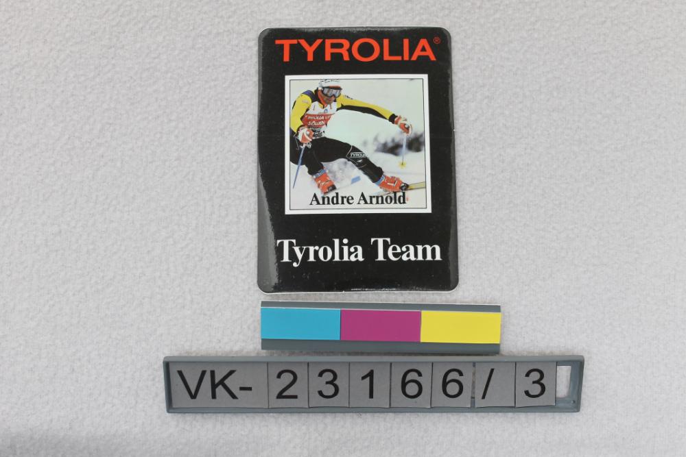 Rechteckiger Aufkleber, schwarz mit einer Farbfotografie, Text: "TYROLIA", "Andre Arnold", "Tyrolia Team". Auf der Rückseite die Herstellermarke der Folie: "jac".