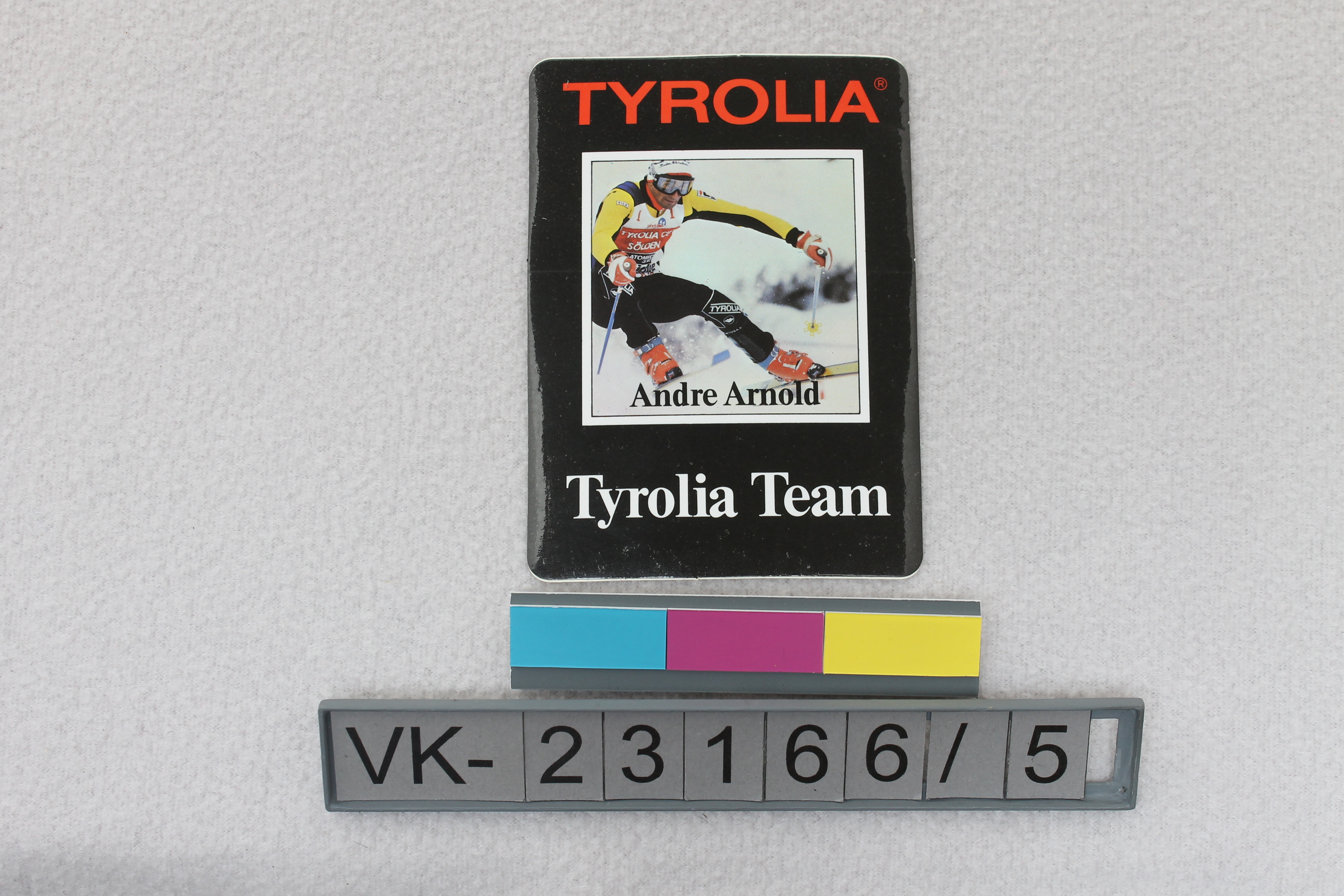 Rechteckiger Aufkleber, schwarz mit einer Farbfotografie, Text: "TYROLIA", "Andre Arnold", "Tyrolia Team". Auf der Rückseite die Herstellermarke der Folie: "jac".