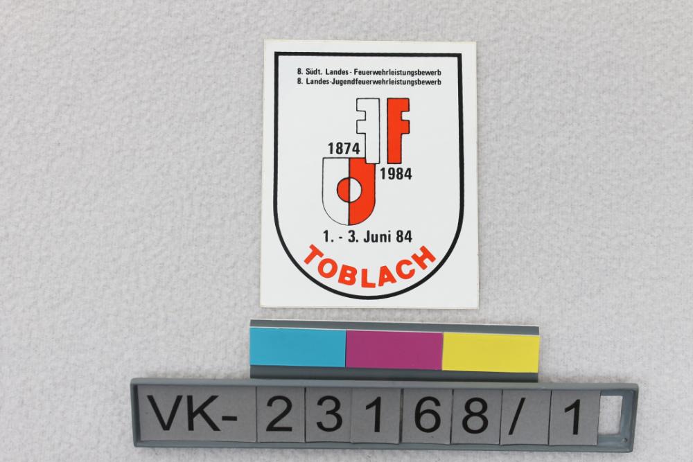 Wappenförmiger Aufkleber, rot und weiß mit schwarzer Schrift, zu einem Feuerwehrleistungsbewerb in Toblach 1984. Auf der Rückseite die Herstellermarke der Folie: "FasCal PERMANENT".