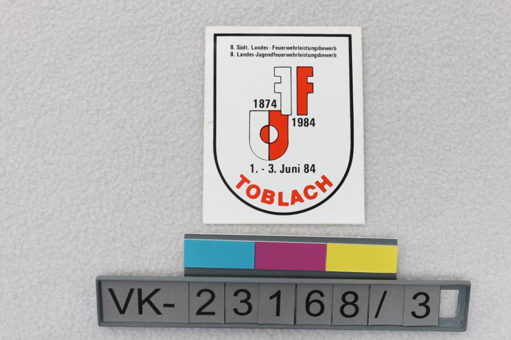 Wappenförmiger Aufkleber, rot und weiß mit schwarzer Schrift, zu einem Feuerwehrleistungsbewerb in Toblach 1984. Auf der Rückseite die Herstellermarke der Folie: "FasCal PERMANENT".