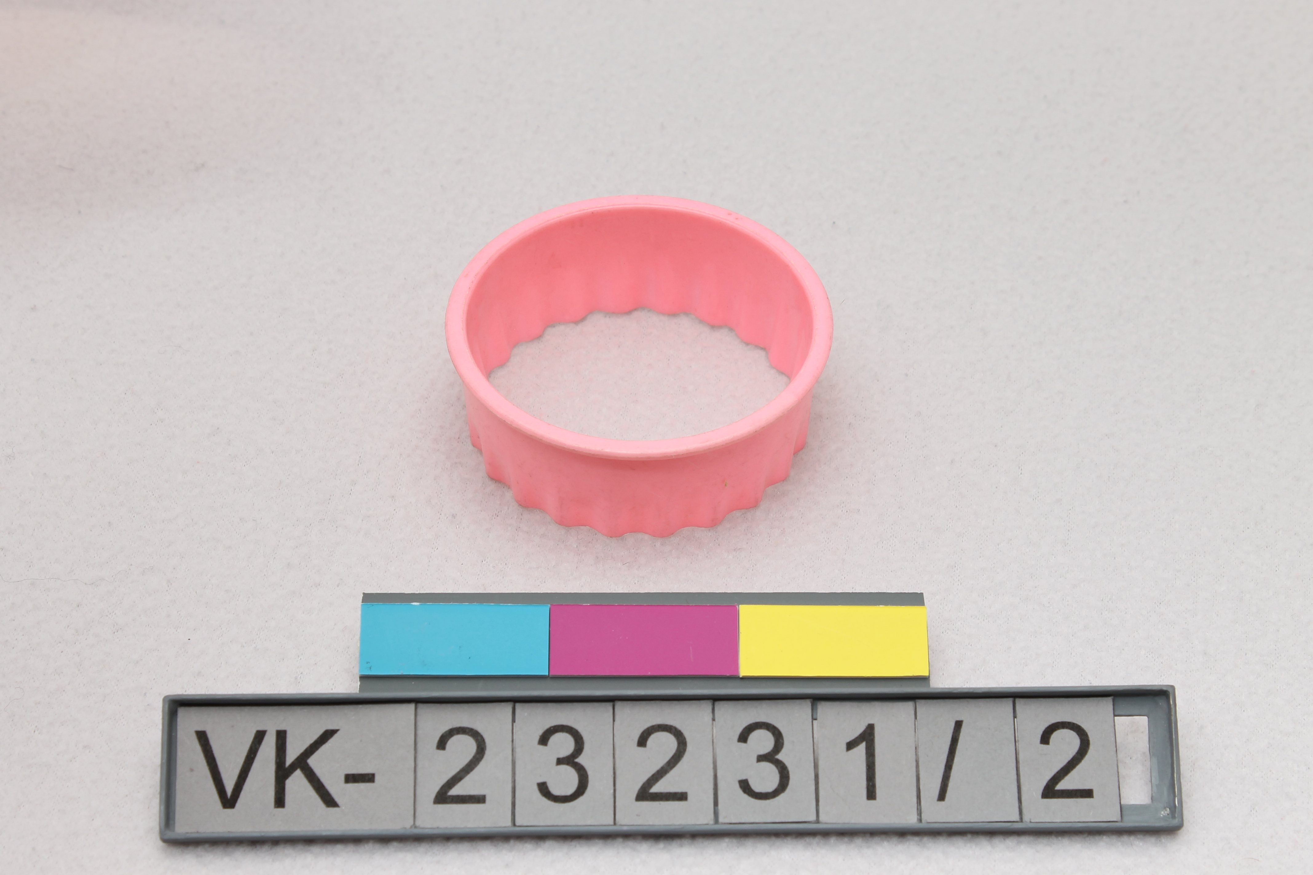 Ausstechform aus rosa Kunststoff, rund mit gewelltem Rand.