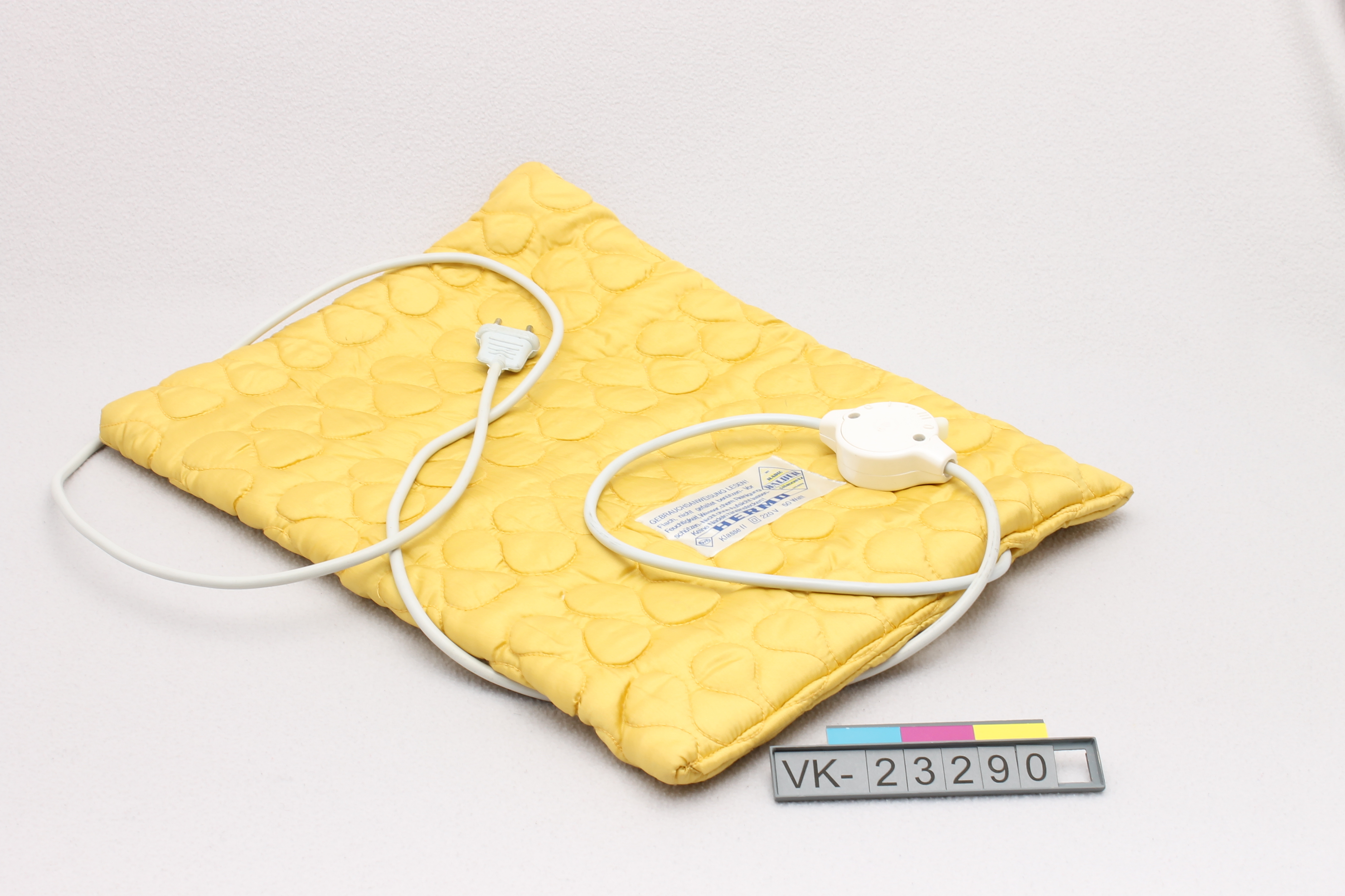 Gelbes gestepptes Heizkissen mit weißem Kabel, daran ein mehrstufiger Regler und ein Stecker. Das Heizkissen hat ein Etikett mit technischen Informationen und Markenzeichen: "HERMO". Die Inventarnummer befindet sich am Regler.