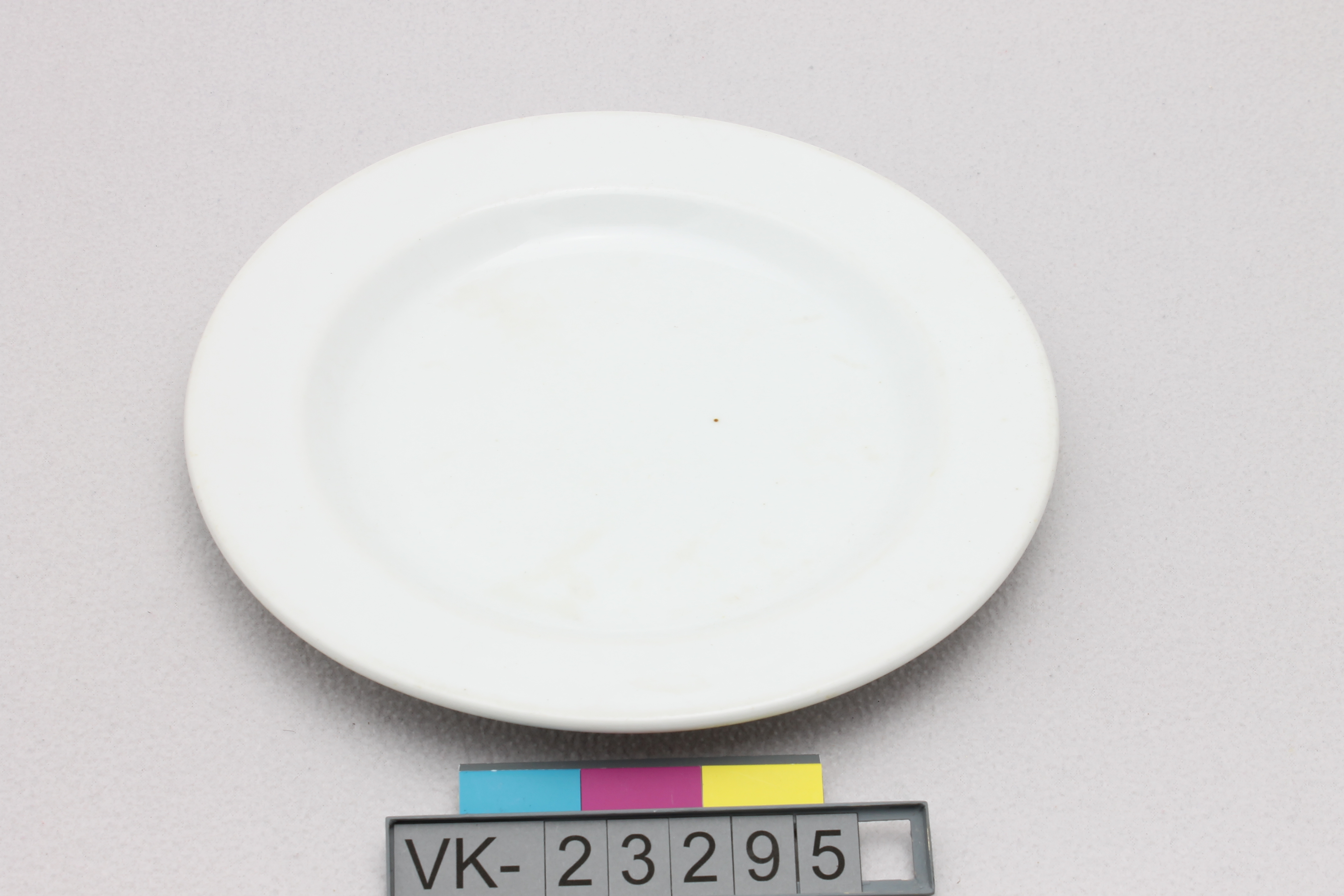 Flacher weißer Teller mit Markenzeichen auf dem Boden: "Hutschenreuther Hohenberg Germany", Arbeitsfrontsymbol, "MODELL DES AMTES SCHÖNHEIT DER ARBEIT".