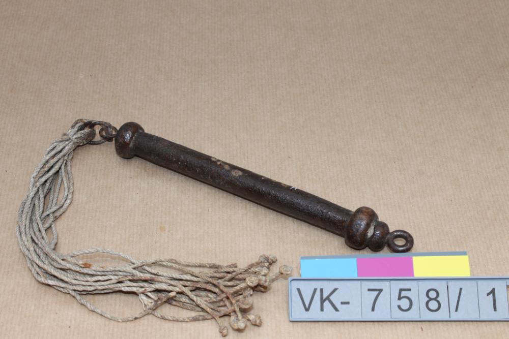 Geißel (Peitsche) mit geradem Griff und einem Bündel Schnüren, deren Enden geknotet sind.