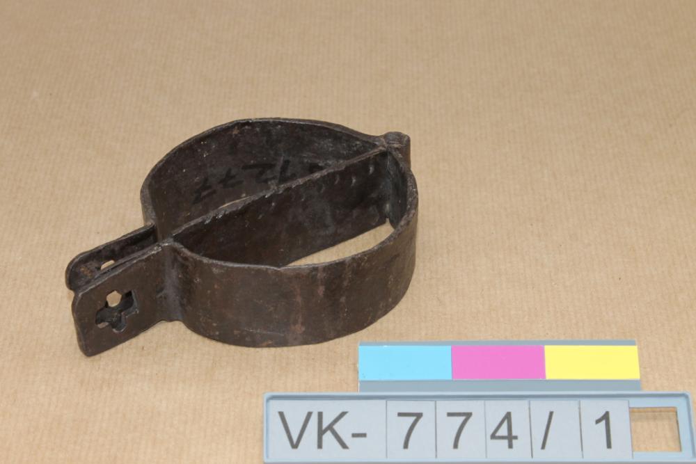 Handschellen, Variante für beide Hände in einer Schelle mit Trennblech. 1870 gefunden auf dem Friedhof Drosendorf, am Begräbnisplatz für Hingerichtete oder Verbrecher.
