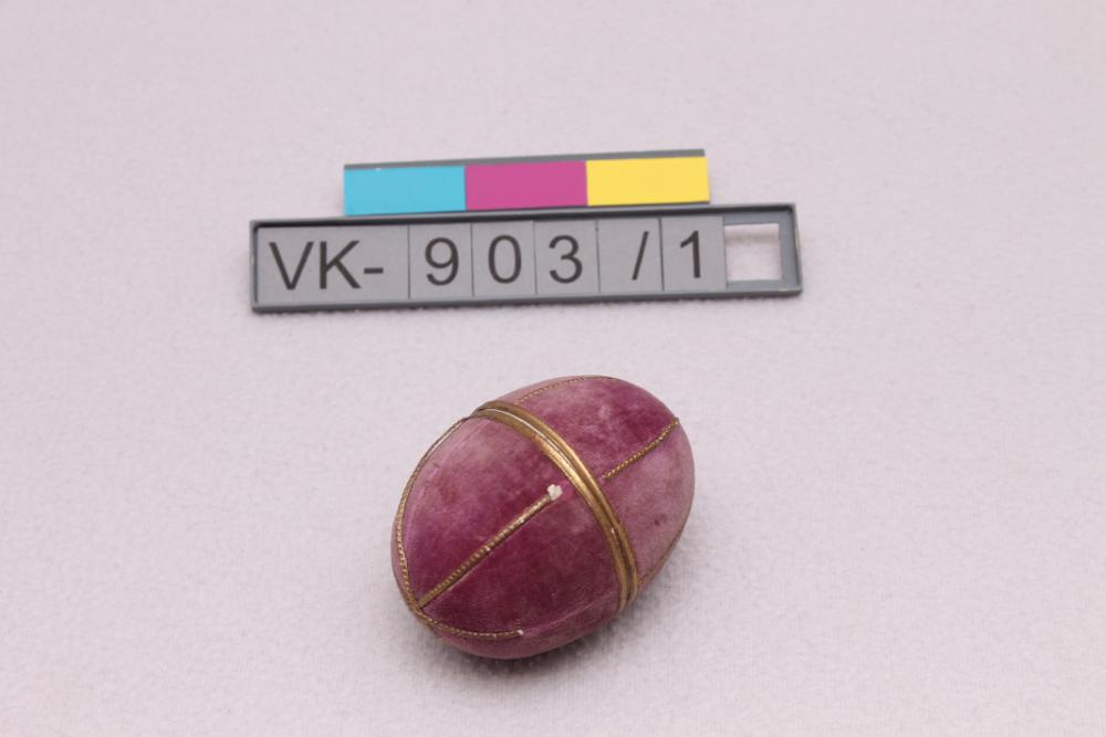 Zweiteiliges Ei (eigentlich Ellipsoid) aus Karton und Papier, außen vollflächig mit violettem Samt bezogen. Zusätzlich sind schmale strukturierte Goldbänder als Zier aufgeklebt.
