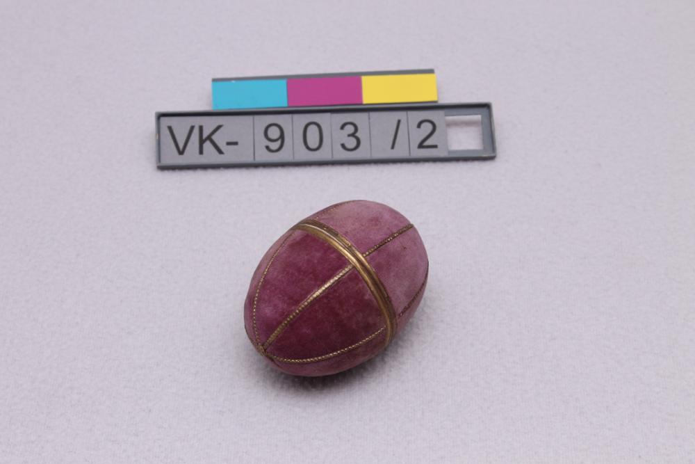 Zweiteiliges Ei (eigentlich Ellipsoid) aus Karton und Papier, außen vollflächig mit violettem Samt bezogen. Zusätzlich sind schmale strukturierte Goldbänder als Zier aufgeklebt.