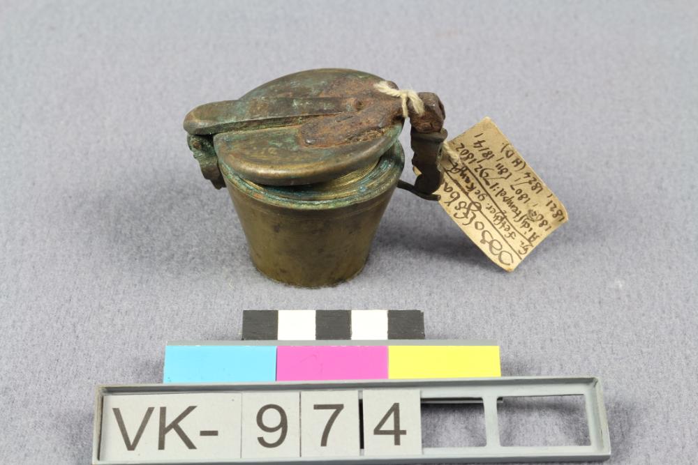 Ein Satz Bechergewichte aus Messing mit einem Aufbewahrungsgewicht mit Klappdeckel und sieben ineinander gestapelten kleineren Gewichten. Die Gewichte sind mit unterschiedlichen Punzierungen (Doppeladler, Zahlen, Buchstaben) versehen.
