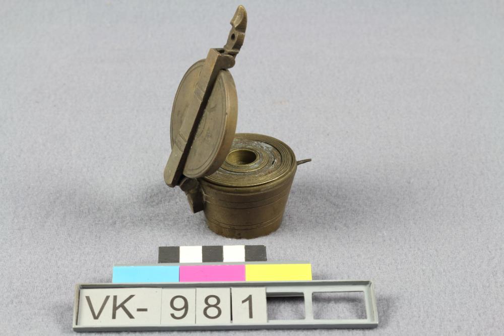 Ein Satz Bechergewichte aus Messing mit einem Aufbewahrungsgewicht mit Klappdeckel und sechs ineinander gestapelten kleineren Gewichten. Die Gewichte sind mit unterschiedlichen Punzierungen (Doppeladler, Zahlen, Buchstaben) versehen.