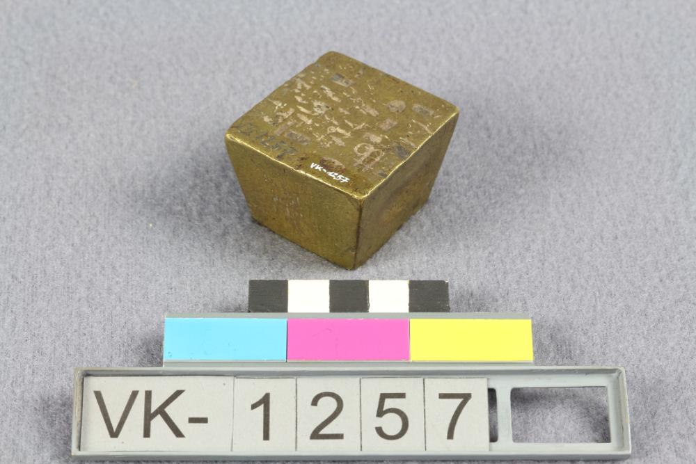 Viereckiges Messinggewicht mit diversen Punzierungen.
