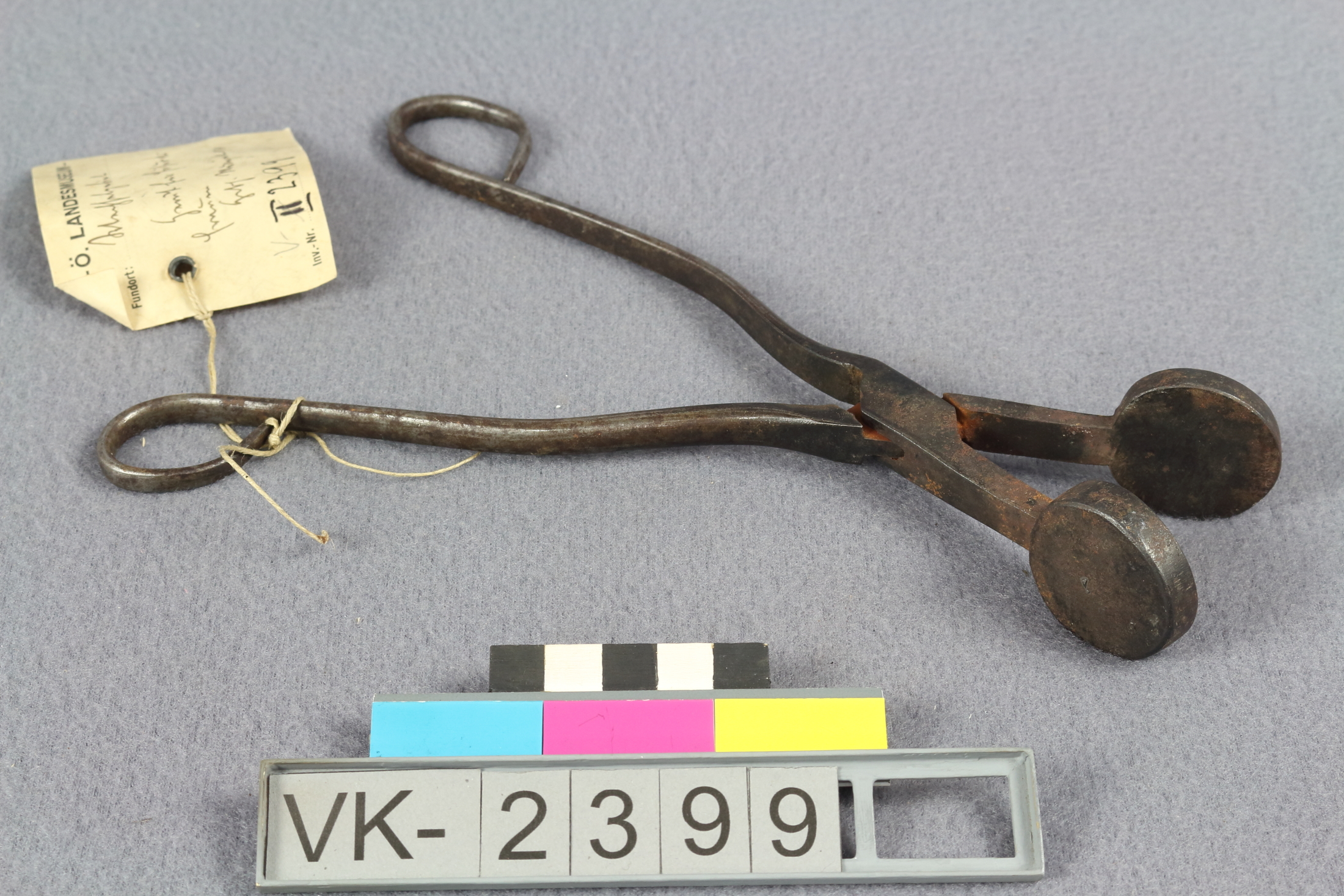 Friseurgerät für Damenfrisuren; Schere mit zwei runden Backen aus Eisen.