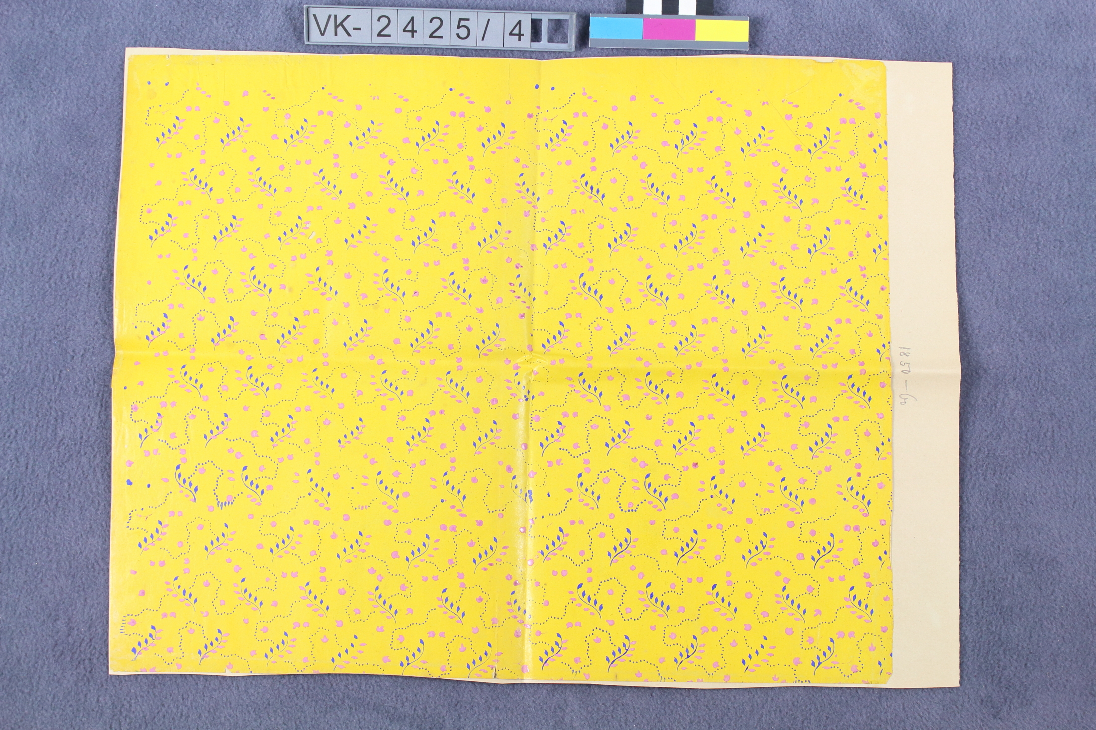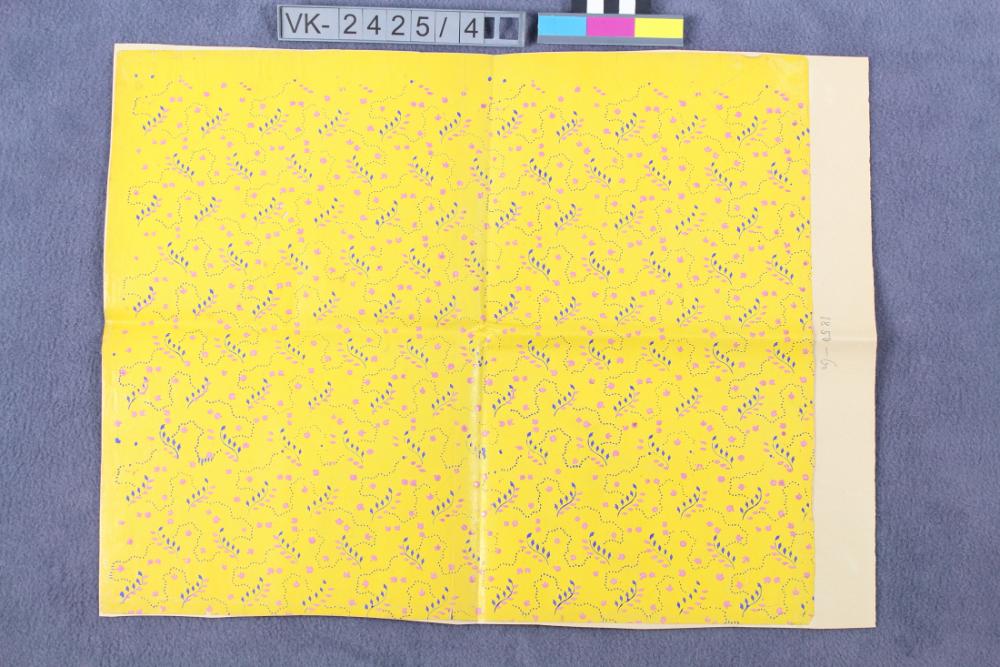 Rechteckiges ausgeschnittenes Stück einer Tapete. Muster: Bättchenranken und gepunktete Linien in blau und rosa auf gelber Grundfarbe.