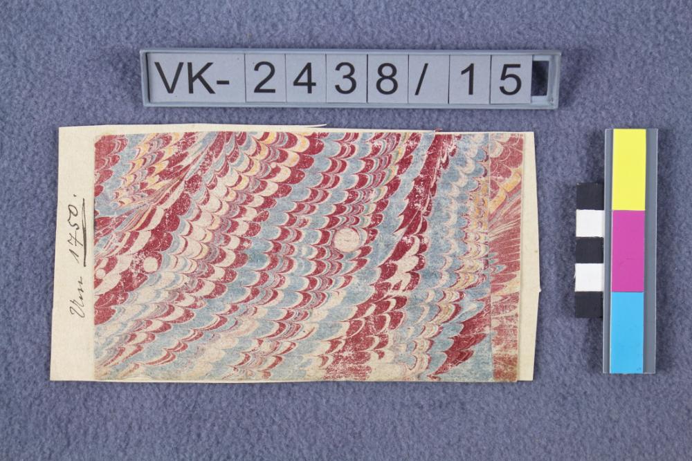 Rechteckiges ausgeschnittenes Stück einer Tapete. Muster: Blau, gelb und rot marmoriert auf weiß.