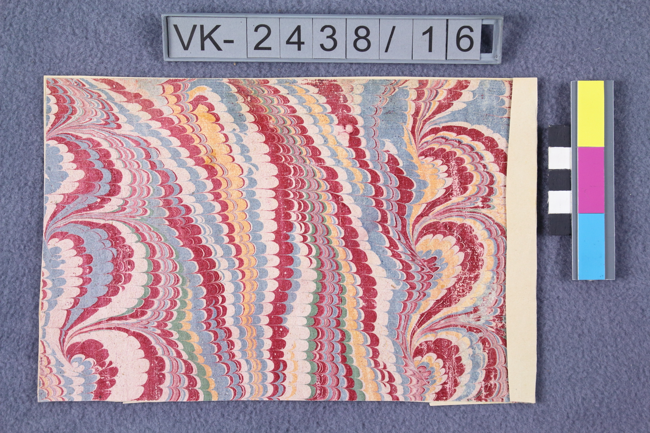 Rechteckiges ausgeschnittenes Stück einer Tapete. Muster: Blau, gelb und rot marmoriert auf weiß.