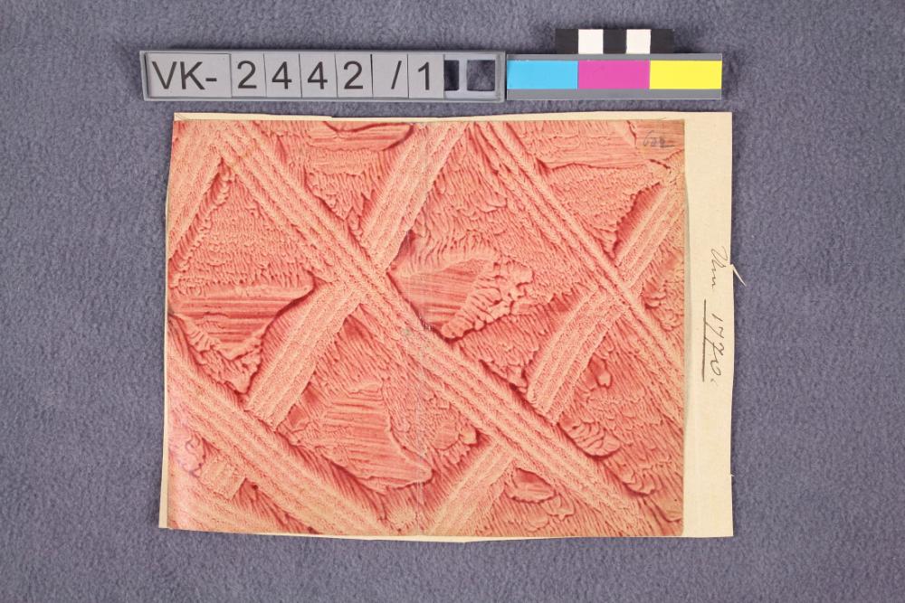 Rechteckiges ausgeschnittenes Stück einer Tapete. Muster: Rot marmoriert und kariert (abgeklatscht).