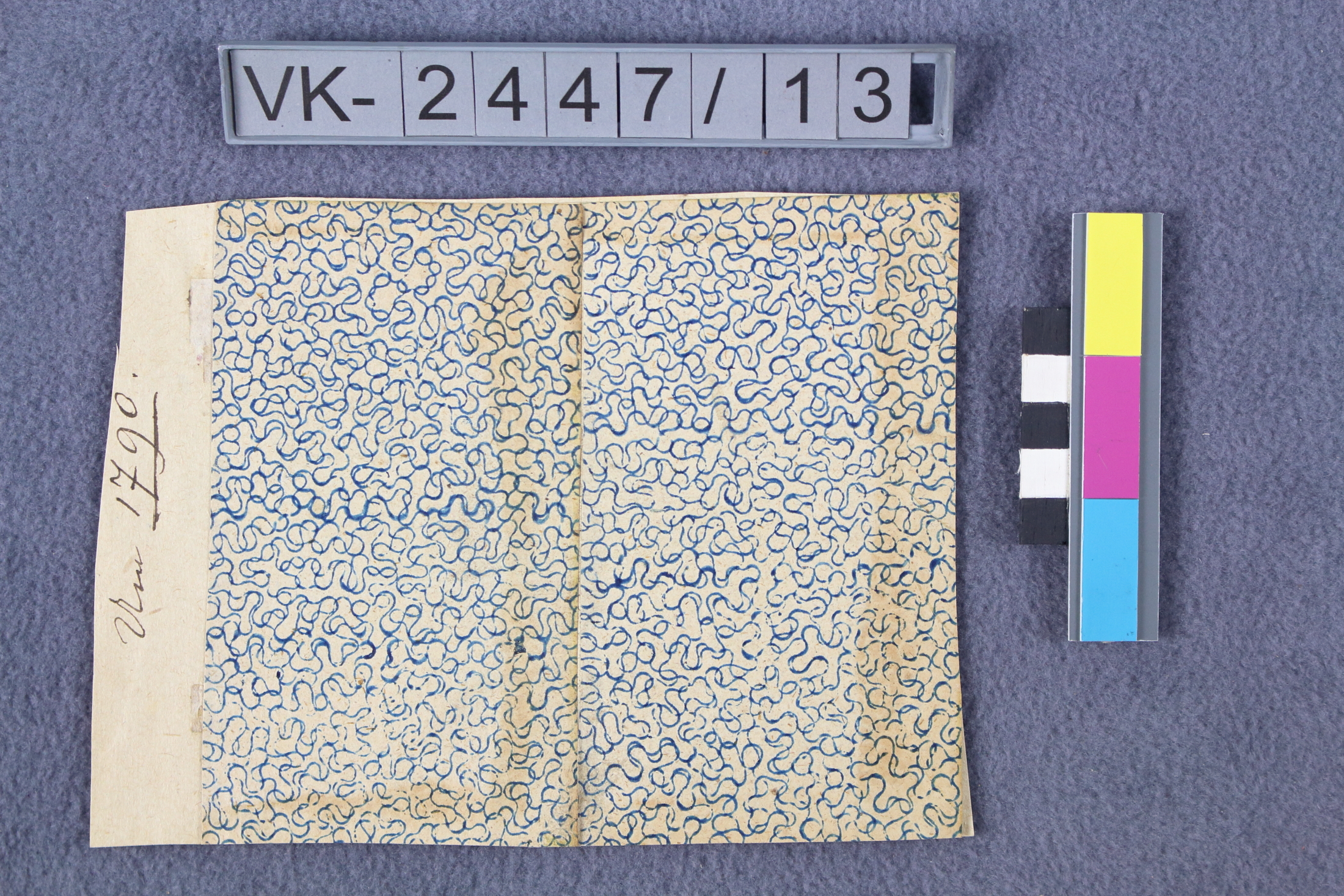 Rechteckiges ausgeschnittenes Stück einer Tapete. Muster: Gewundenes blaues Linienmuster. Wie VK-2447_11.