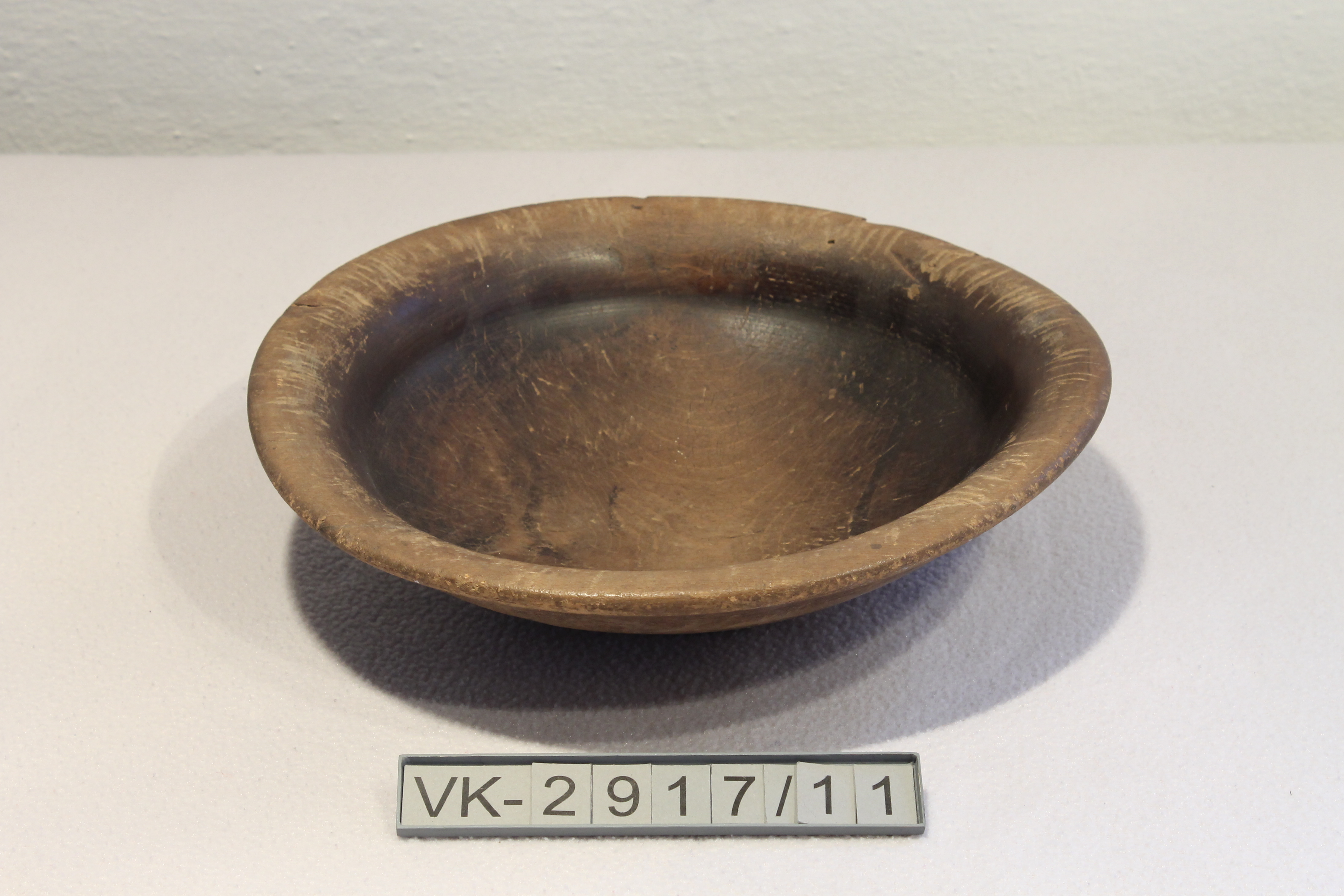 Tiefer Holzteller mit eingeritztem Buchstaben "A" am Boden. Der Teller stammt aus dem Karner in Zellerndorf, es handelt sich vermutlich um eine Grabbeigabe.