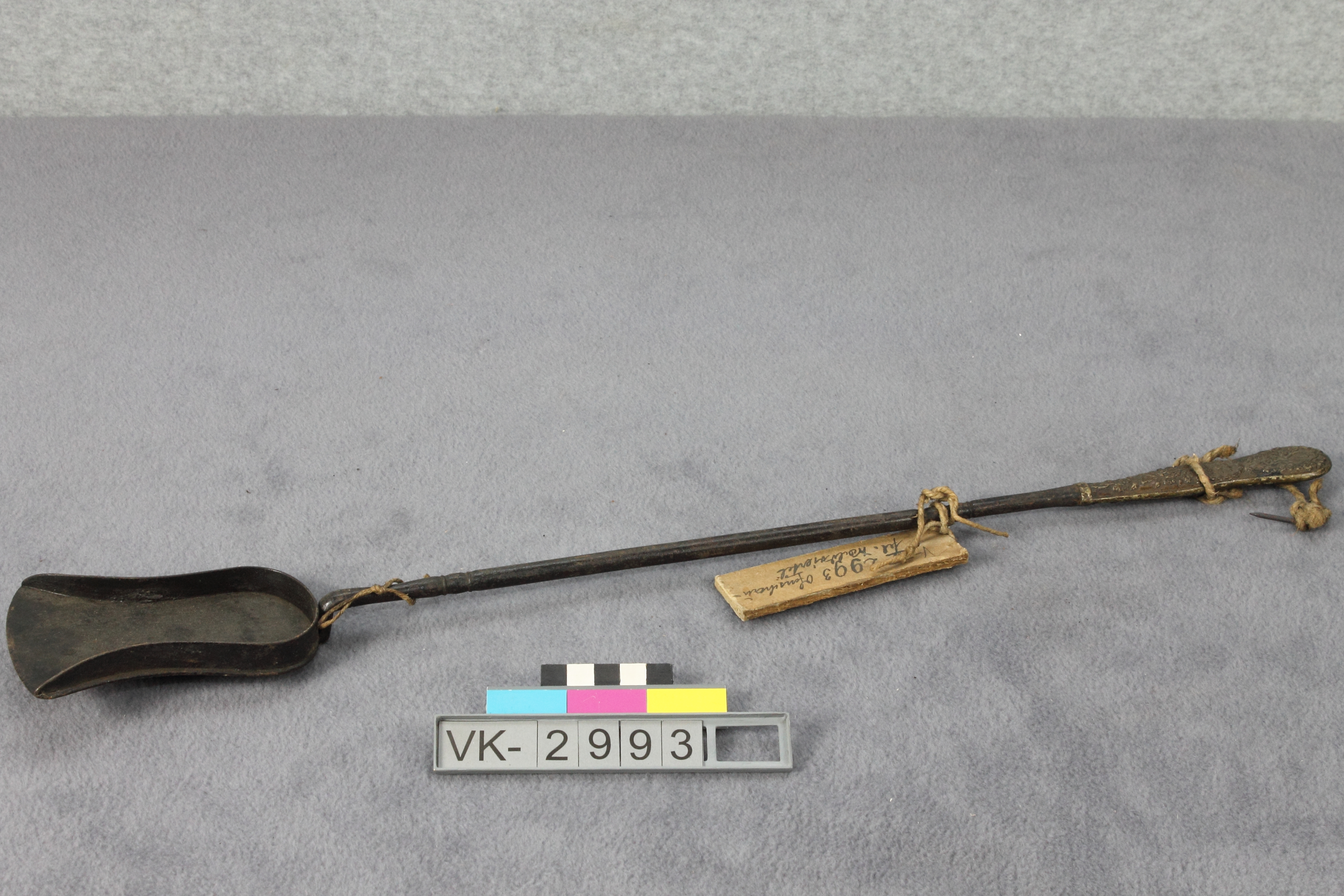 Ofenschaufel mit leichter Birnenform, einem langen Stiel und einem ornamental im Halbrelief verzierten Messinggriff.