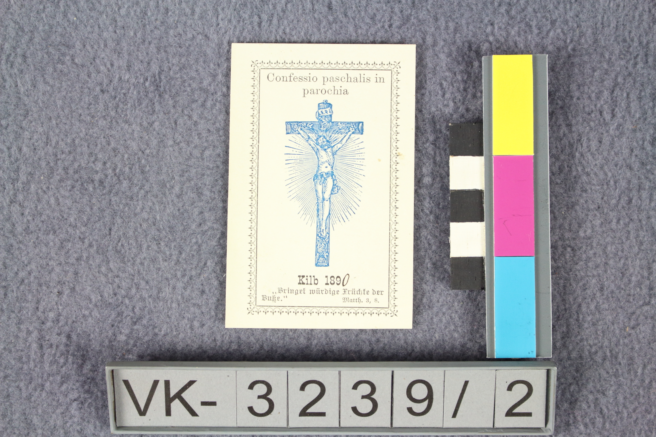 Beichtzettel mit Kruzifix, "Confessio paschalis in parochia", datiert 1890 in Kilb.