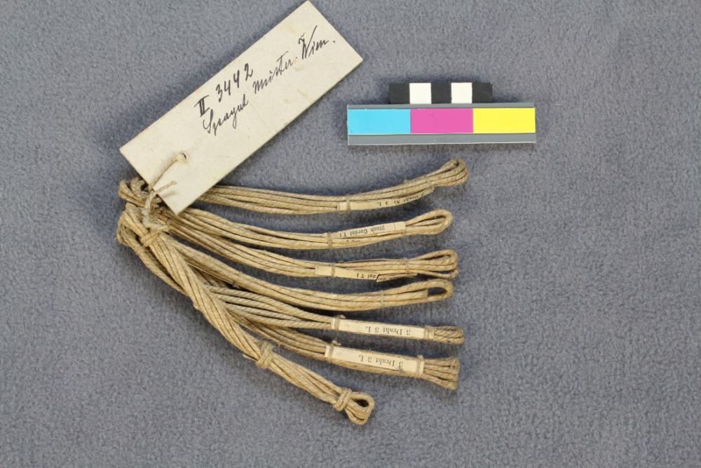 Sieben Spagatmuster, zusammen gebunden. Die Garne haben, soweit noch vorhanden, Papierstreifchen mit Angaben zur Garnqualität.