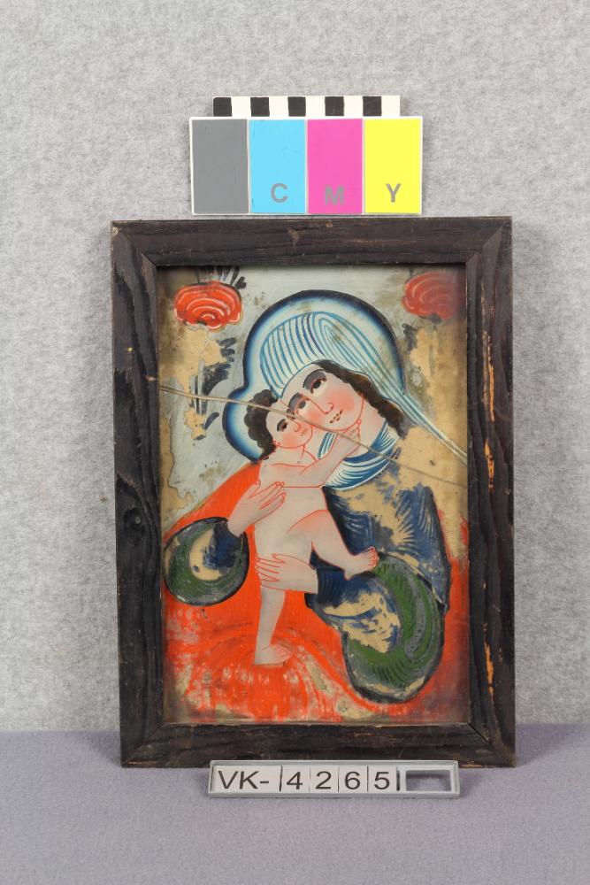 Hinterglasbild: Maria und Jesus, in den oberen Ecken Rosen.