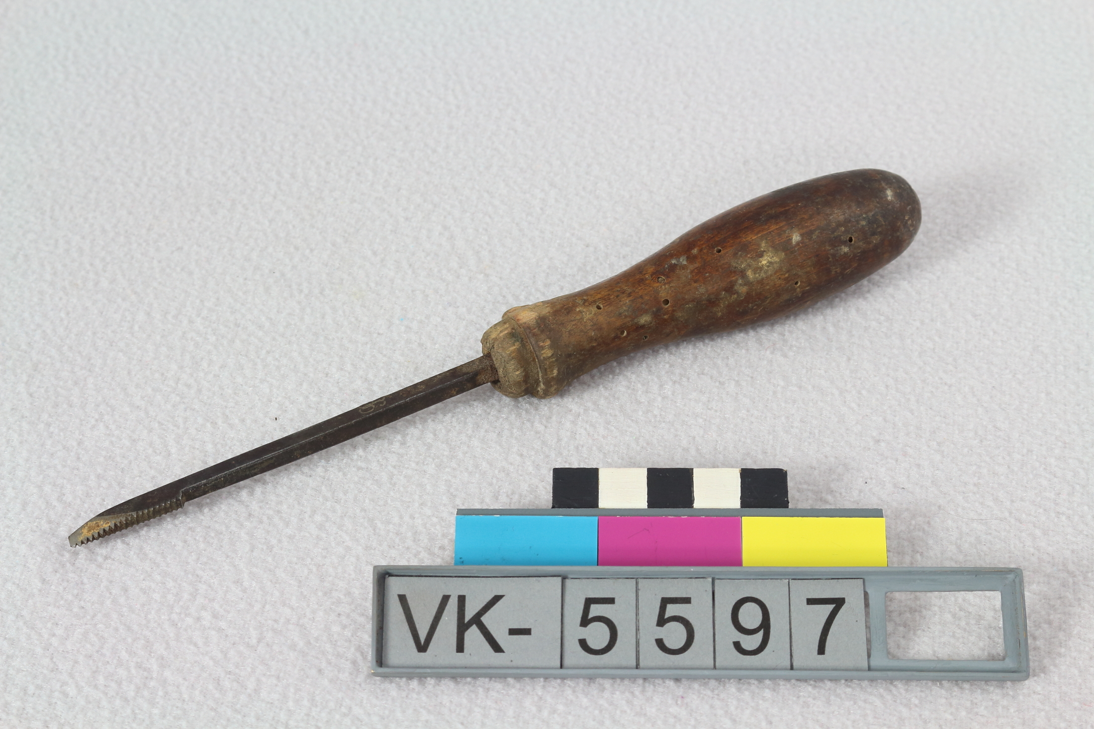 Kurze schmale Feile mit langem Schaft und einem Holzheft.