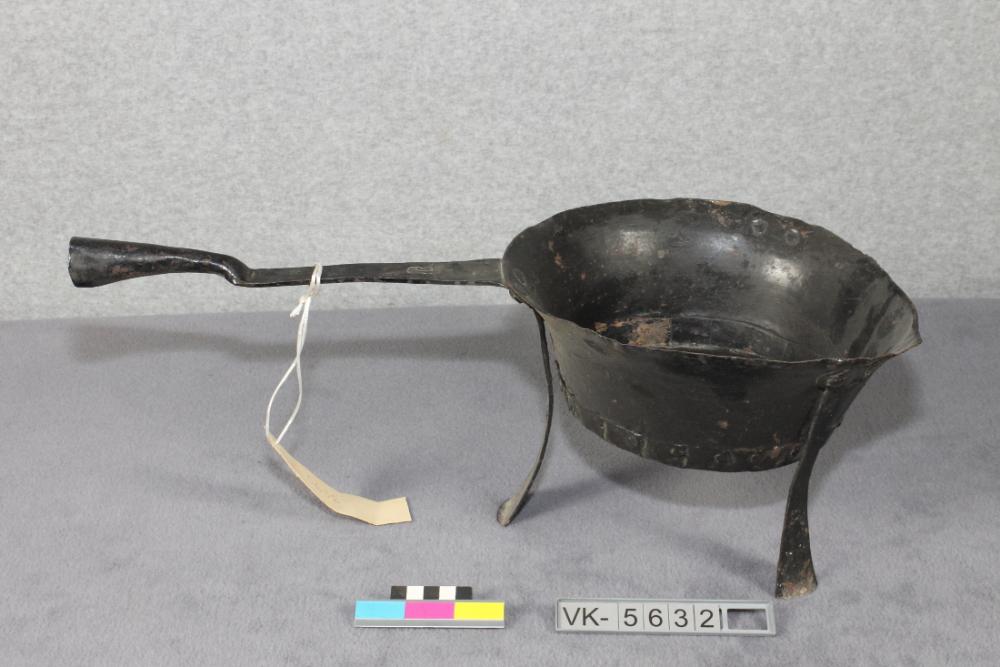 Tiefe trichterförmige Pfanne mit drei Füßen, ausgestelltem Rand und einem Stiel, dessen Ende zu einer Tülle geformt ist. Auf dem Stiel ist eine Punzierung: "VJ".