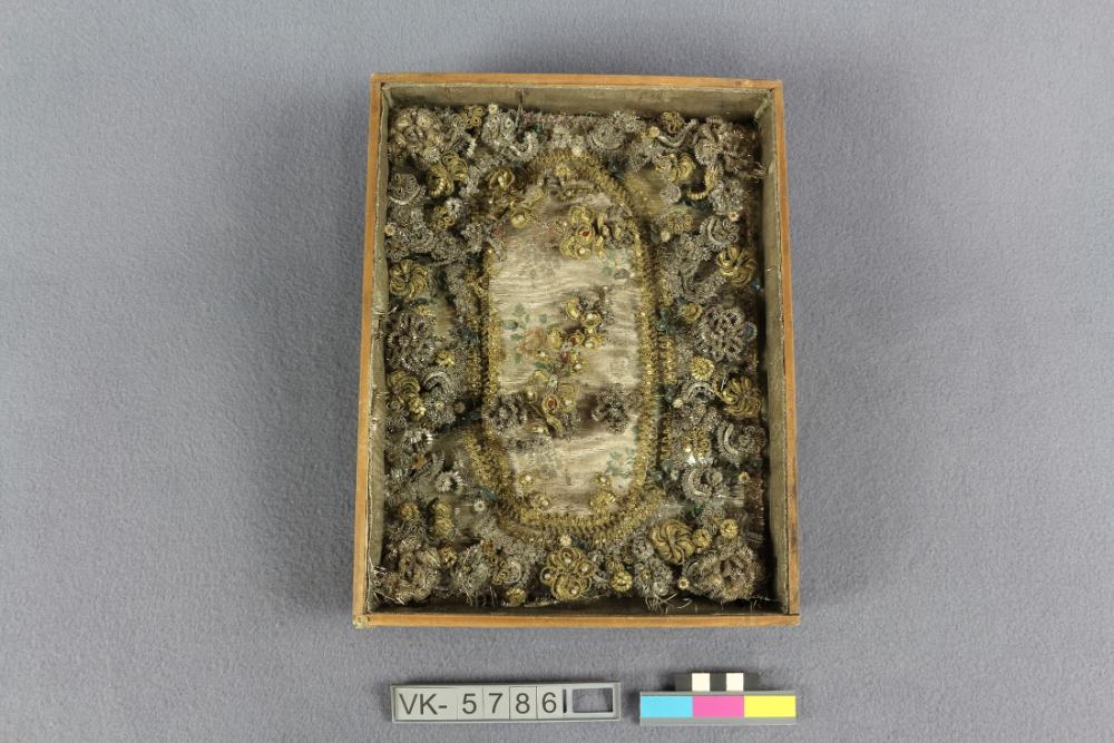 Laut Inventarbuch ehemals mit Nagel und Kreuz ausgestattete Klosterarbeit in einem Holzkästchen; auf Brokatstoff sind diverse Chenilleverzierungen mit Perlen eingearbeitet.
