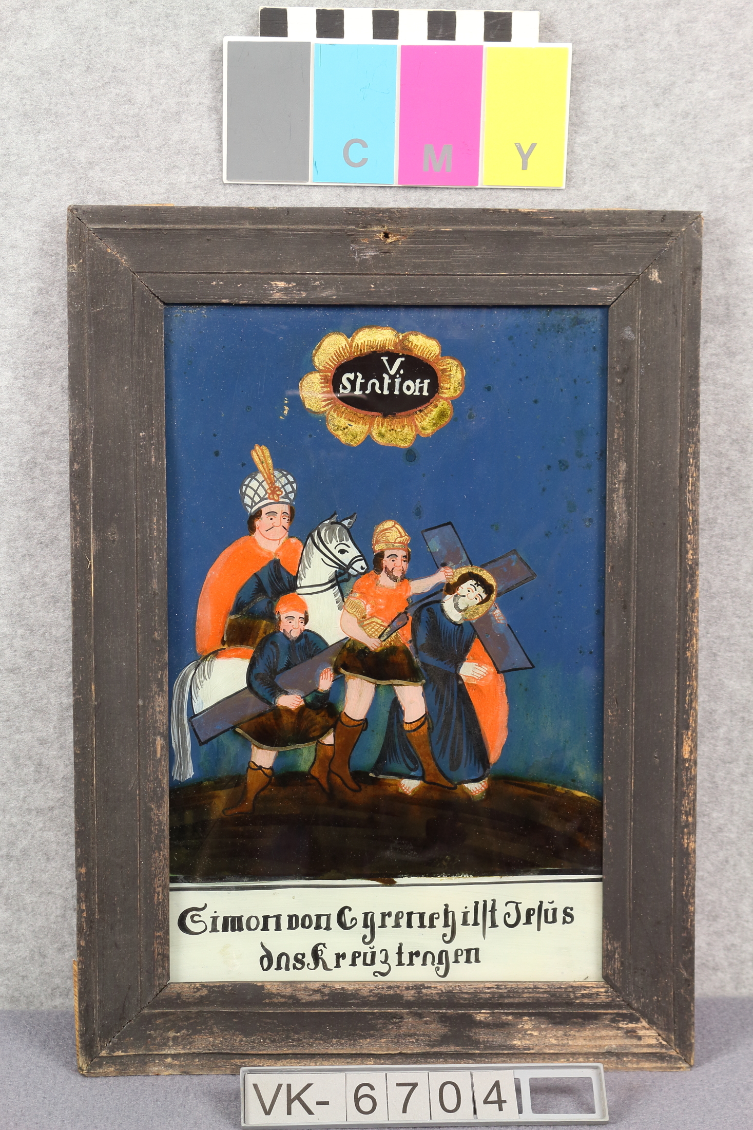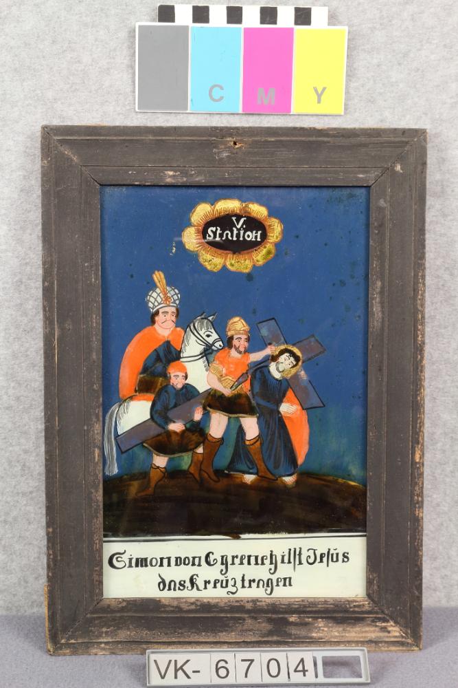 Hinterglasbild in einem schwarzen Holzrahmen mit mehrfärbiger Darstellung einer Kreuzwegstation: 5. Station, Simon hilft Jesus das Kreuz zu tragen.