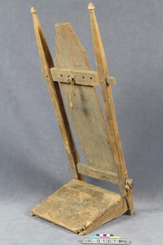 Holzkraxe mit rechteckiger Ladefläche und einem Rahmen mit nach oben zugespitzten Seitenträgern.