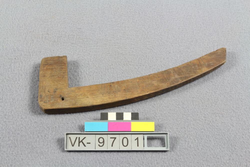 Binderwinkel: Holzbrettchen mit Krümmung, Griffbereich und einer eingeschnittenen Skala. Beschriftungen: "1885", "15".